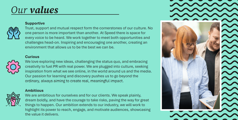 We want to be at the forefront of the evolving world of comms for both business and consumer brands, creating brilliant, award-winning work that has lasting impact. We want to help our team top their creative game, get their ambitions fulfilled, be ever curios and have fun along the way. Where both our team and clients are proud to be a part of Speed.